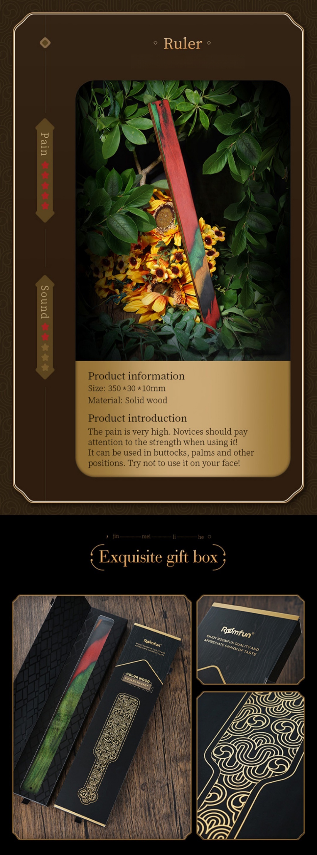 The colorful punishment ruler is based on natural wood and combines modern dyeing technology to create a private tool that is both artistic and practical. Every texture is hand-polished by craftsmen, with a warm and delicate touch, saying goodbye to the cold mechanical feeling, making intimate interactions more aesthetically pleasing.