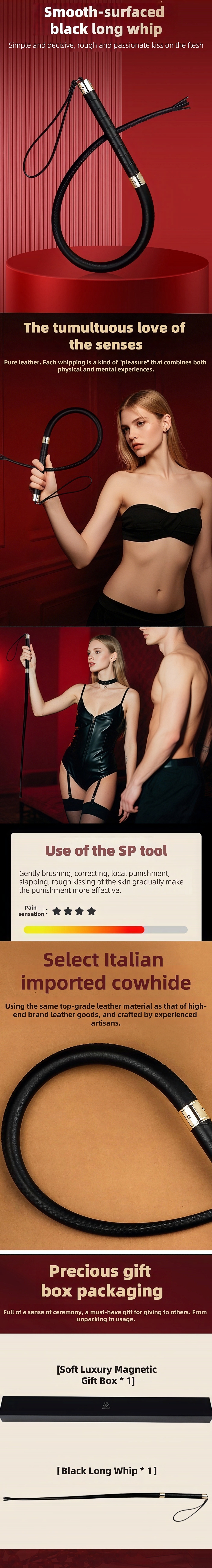 The smooth black long whip simply, neatly and roughly kisses the flesh and skin. Making up one's mind to leave oneself at the mercy of others and let everything that should happen happen happen is both a capability and a kind of liberation. It is made of the same top-grain leather .as high-end luxury brand leather goods and handcrafted by experienced artisans
