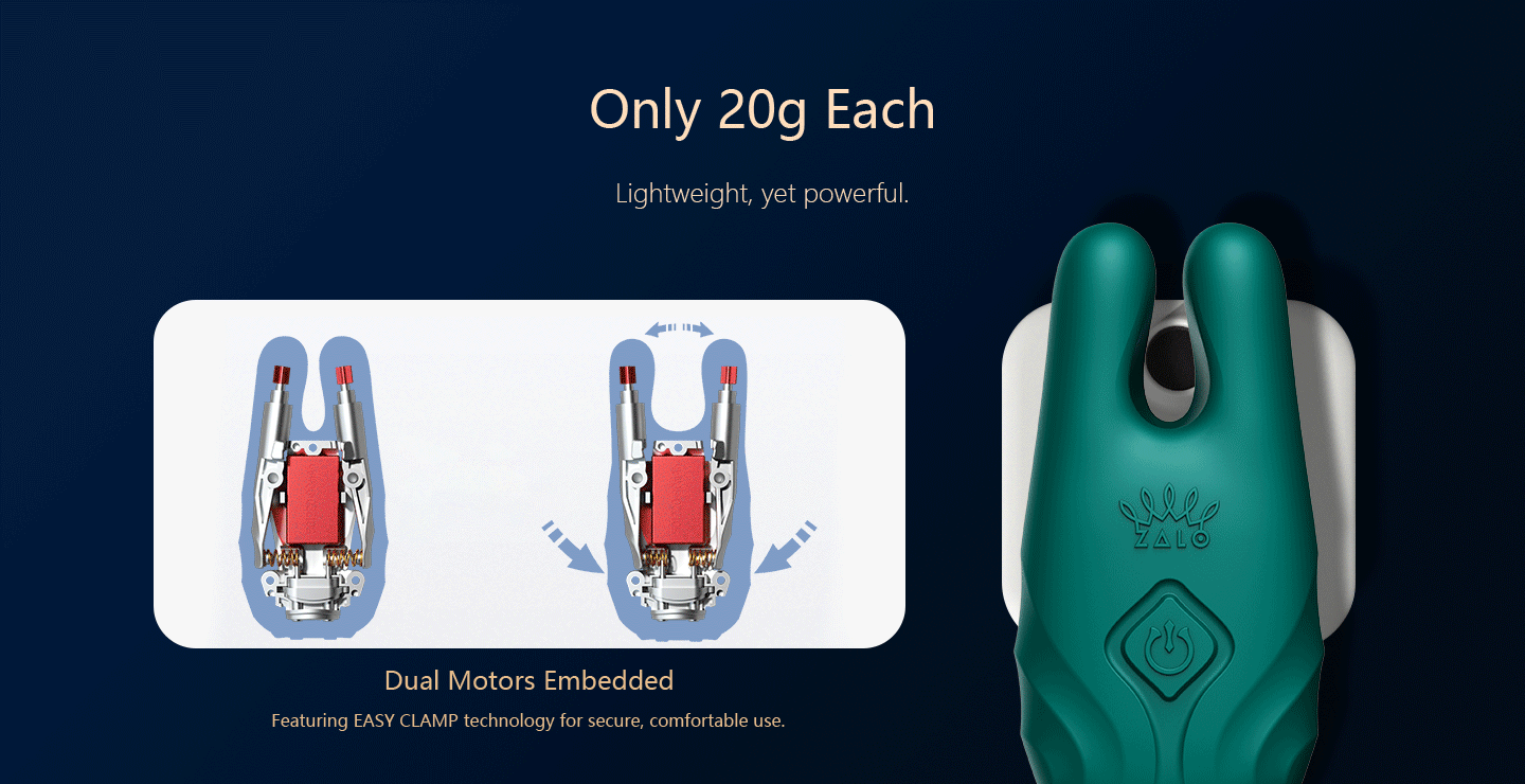 NAVE is elevating nipple play to legendary new heights with powerful vibration and one-of-a-kind EasyClamp technology that makes it exceptionally easy to clasp onto your body. Inspired by the sleek and striking appearance of the ancient goddess Nephthys, NAVE features dual motors in both of its cat ear-like tips that will surround each nipple with powerful vibration when it’s clamped. NAVE’s rumbly vibrations are also silent for discreet, non-distracting play. Each NAVE nipple clamp is concealed by a layer of luxuriously silky-smooth liquid silicone and showcases ZALO’s EasyClamp technology. Gently pinch the bottom sides of NAVE to open the clamp and attach it to nipples and other erogenous parts of the body. NAVE also comes with additional clamp tips to accommodate different nipple sizes. One of the tip size options is suitable for nipples with a diameter of 8-15 mm, and can also be used by people that have given birth. The clamp’s flat interior comfortably secures around the nipple. The other size option fits nipples with a diameter of 5-10 mm, and features an interior with friction points that intensify the stimulating sensation. Compatible with the ZALO Remote Pro App, NAVE can be controlled remotely and is can also be paired with all other ZALO wireless remote toys.