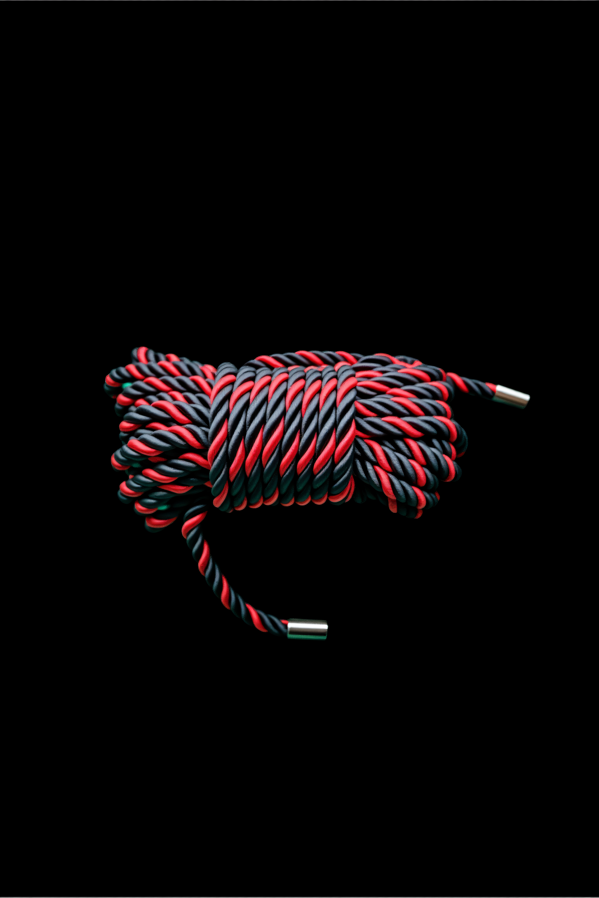 With a 7mm diameter, it is thick enough for secure binds yet flexible enough for intricate ties, making it perfect for both beginners and experienced riggers. The black and red twisted design symbolizes power and passion, while the reinforced metal tips prevent fraying, ensuring long-lasting use.
