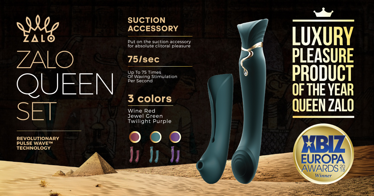 Experience true luxury with the ZALO Queen G-spot PulseWave Vibrator, designed to make you feel like a queen. Inspired by Cleopatra, the Queen's sleek, seductive silhouette, with gold detailing and a real Swarovski embellishment exudes power and opulence. Winner of XBIZ Europa’s 2018 Luxury Product Of The Year award and AVN 'O' Awards' Best Pleasure Product For Women. ZALO has also been honored with XBIZ's prestigious 2019 Excellence in Product Packaging award and 2019 ANME StorErotica award for Excellence in Product Packaging.